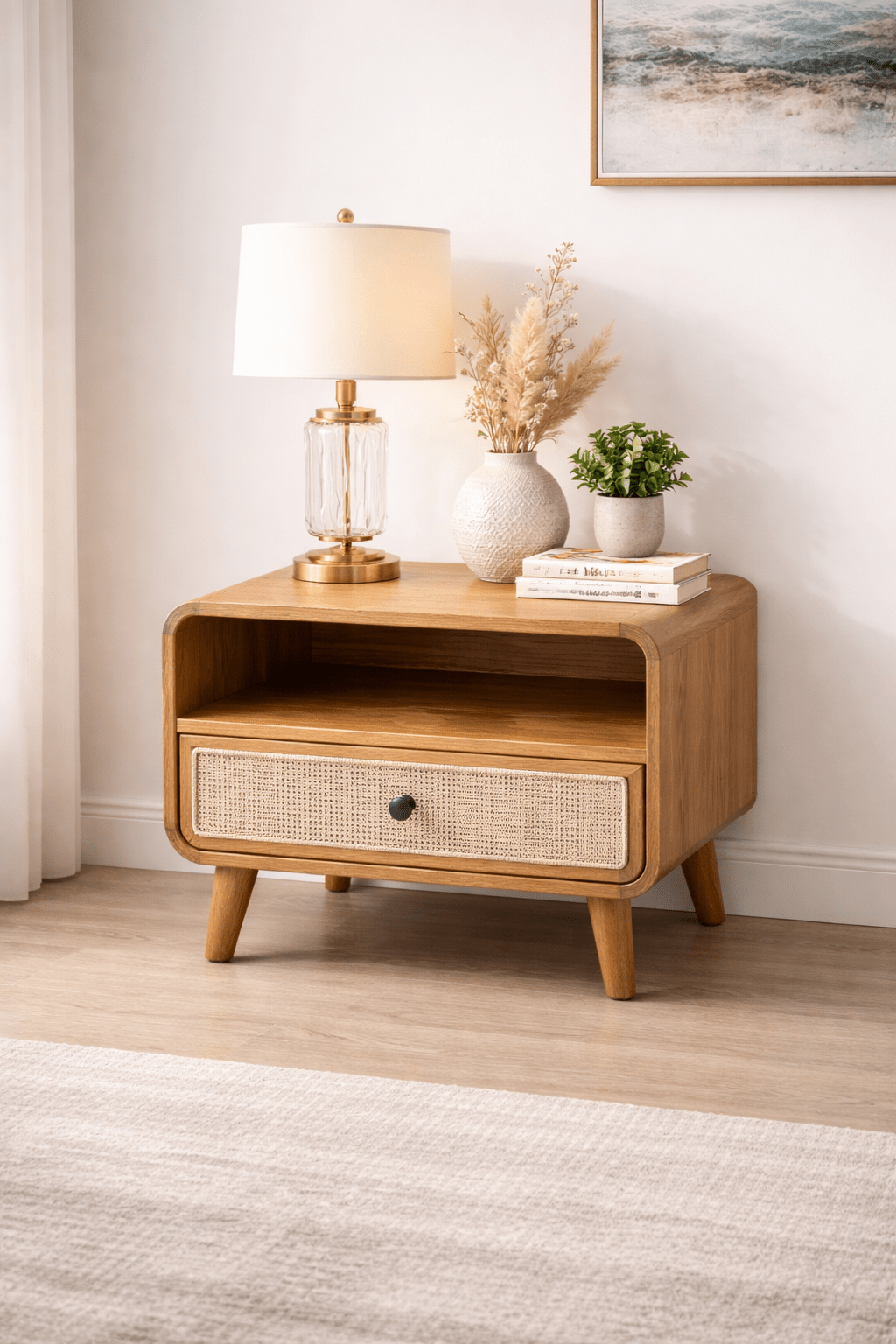 Set of Mid-Century Wooden Nightstands with Cane Drawers